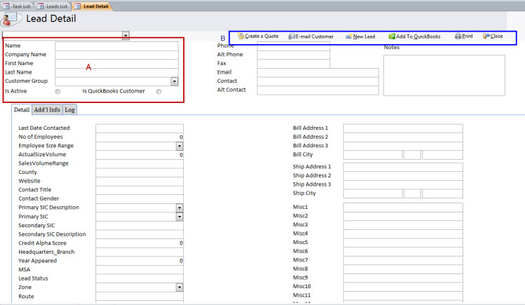 The box labeled "B" contains the buttons: create a quote directly from the lead, email the lead, create new lead, add lead to QuickBooks and print.